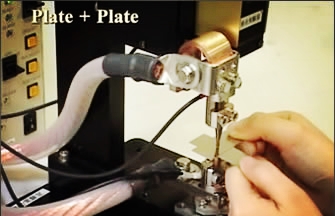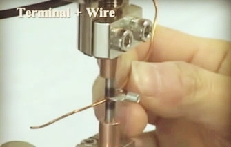 漆包線的焊接 馬達的端子、U型端子與漆包線的焊接(熔接)。電極使用電阻高而發熱的鎢、钼等金屬。焊接電流採(cǎi)用兩段通電方式,首先使用予通電将絕緣漆熔化掉,然後利用主通電段将芯線與端子焊接在一起。U型端子也有挾住芯線利點。馬達以外也有繼電器、變(biàn)壓器等的漆包線的焊接。